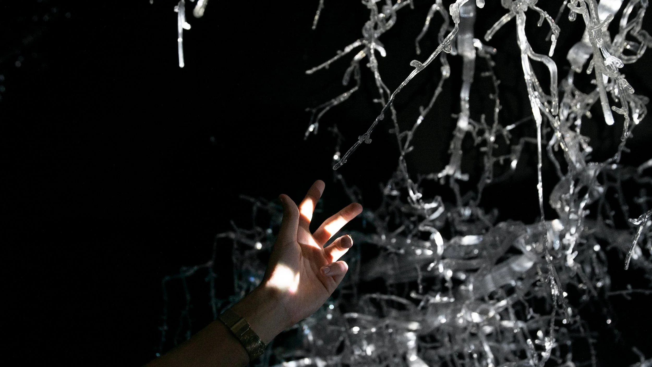 Visitors encounter two large, transparent root-like structures engaged in an ongoing, data-driven exchange.